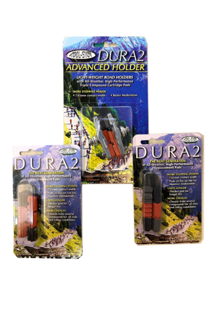 The Dura 2 Advanced Holder is a forged aluminum holder with dual pivot adjustment that houses our Dual Compound Dura Type insert. These holders will fit most Shimano® type brake systems.
