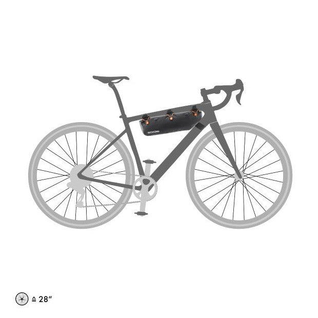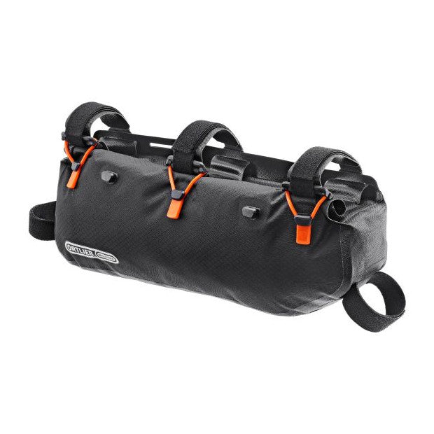 The Ortlieb Frame-Pack RC Toptube is the ideal solution for anyone who wants to continue to be able to carry water bottles, even if their luggage is stored in the frame. This waterproof frame bag with roll-up closure is also ideal for all full-suspension mountain bikes whose shock absorbers limit the space available in the frame triangle. Thanks to its watertight roll-up closure, secured by three silicone rings, this bag from our Bikepacking line complies with the IP 64 standard, thus ensuring that your equipment is protected against unexpected bathing. With a volume of 4 litres, the Frame-Pack RC Toptube allows you to store heavy equipment such as tent pegs, tools or provisions inside the frame triangle, lowering the centre of gravity of your bike. The strong, variable position hook and loop fasteners allow for easy attachment to the top tube and seat tube of the bike.