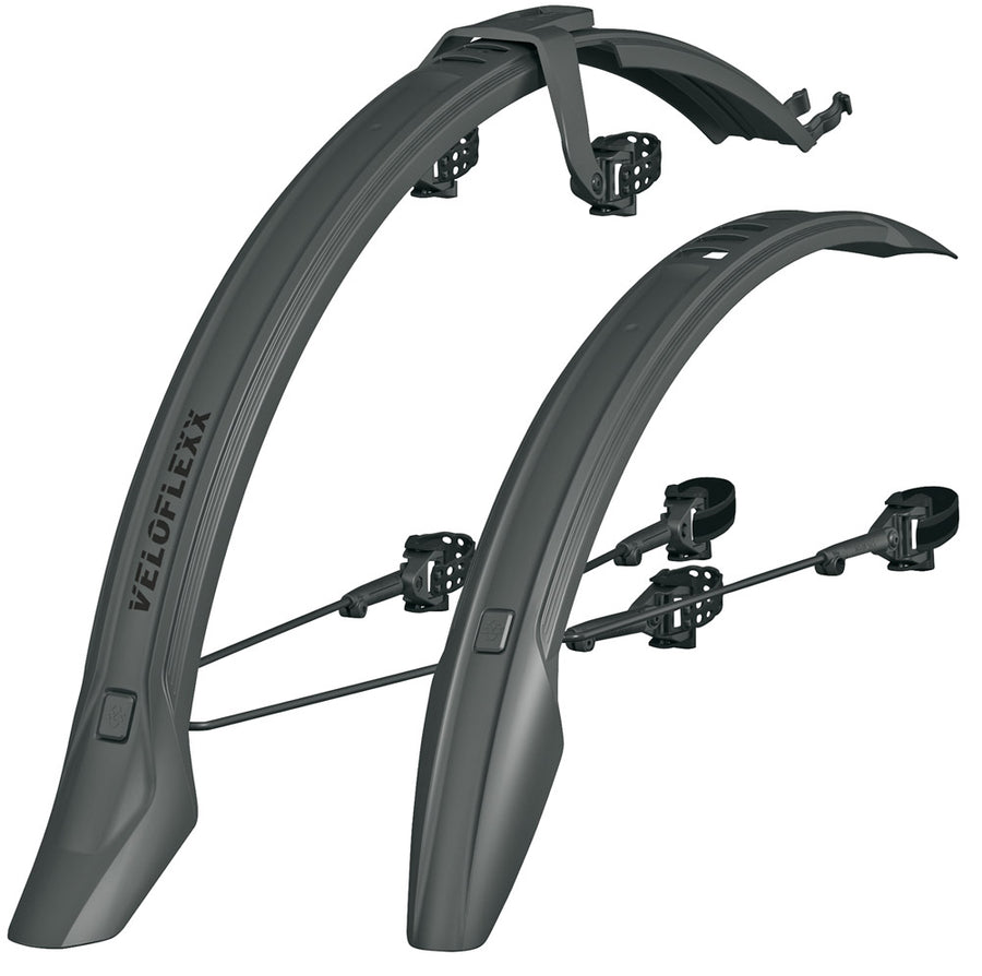 At the front, the VELOFLEXX is mounted on the fork bridge with a rubberised hook and loop fastener or a cable tie. The frame adapters enable the mudguards to be mounted on any fork and for the angle to be adjusted. The black-coated stays provide even greater support. The VELOFLEXX set is suitable for fitness bikes, mountain bikes and city bikes.