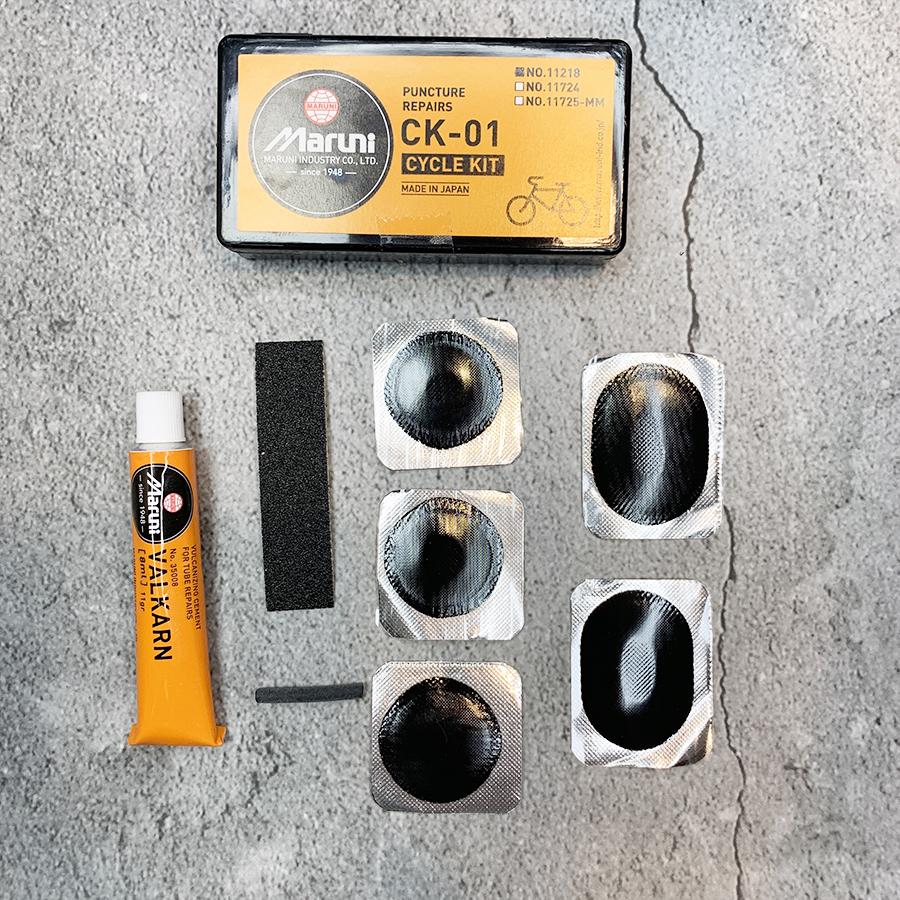 A portable, pocket-sized bicycle and motorcycle tube repair kit in a compact case.