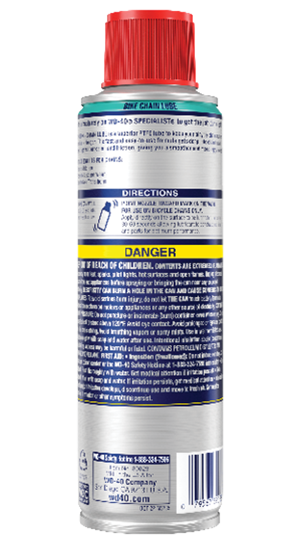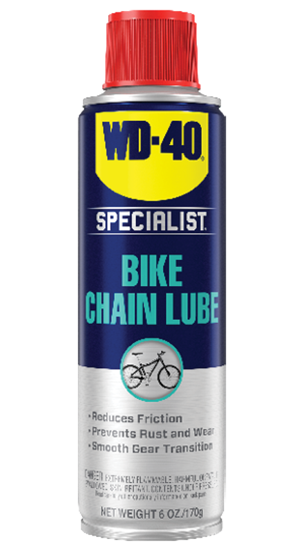 WD-40 Specialist® Bike Chain Lube is an all-conditions lubricant that protects bicycle chains in dry, wet, or varying conditions. The fast and easy-to-use aerosol spray helps prevent squeaks and extends the life of the chain. Its special formula does not contain wax, which leaves a sticky residue that can build up inside chain links and the drivetrain. Contains corrosion-inhibitors for optimal chain protection.