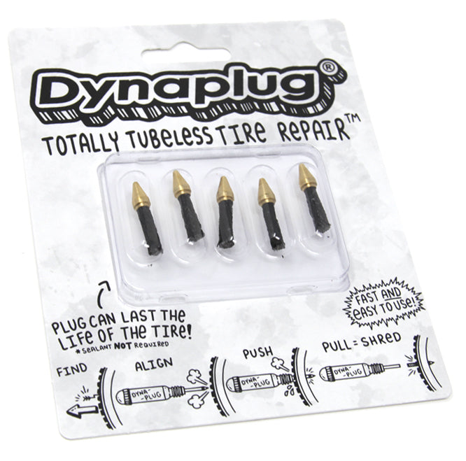 Dynaplug® tubeless tire repair plugs are constructed from viscoelastic rubber impregnated cord and non-abrasive brass tip. The plugs are specially designed to be inserted directly into a puncture. A repair can last the life of your tire if installed correctly. No Sealant required!